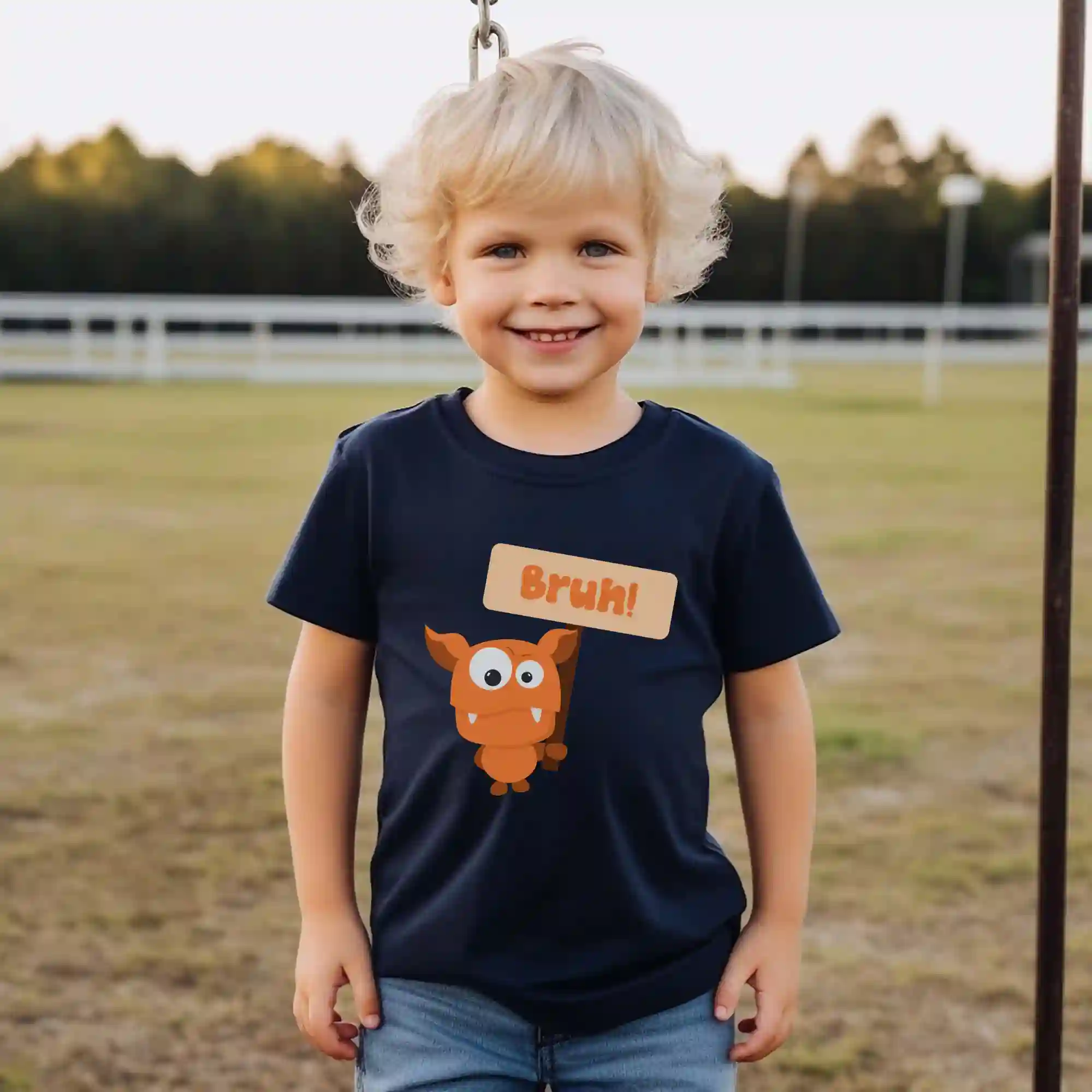 Picture a relaxed one-eyed monster leaning against a large speech bubble that simply reads “Bruh!” in chunky, hand-drawn letters. The monster’s eyelid droops in perfect nonchalance, and its stubby horns tilt sideways as if shrugging at the world. Tiny snore puffs and pastel shadow accents give the impression of a laid-back vibe. Every element of this graphic captures the essence of effortless cool, turning the bruh toddler t-shirt into a must-have statement piece for any laid-back little monster.
