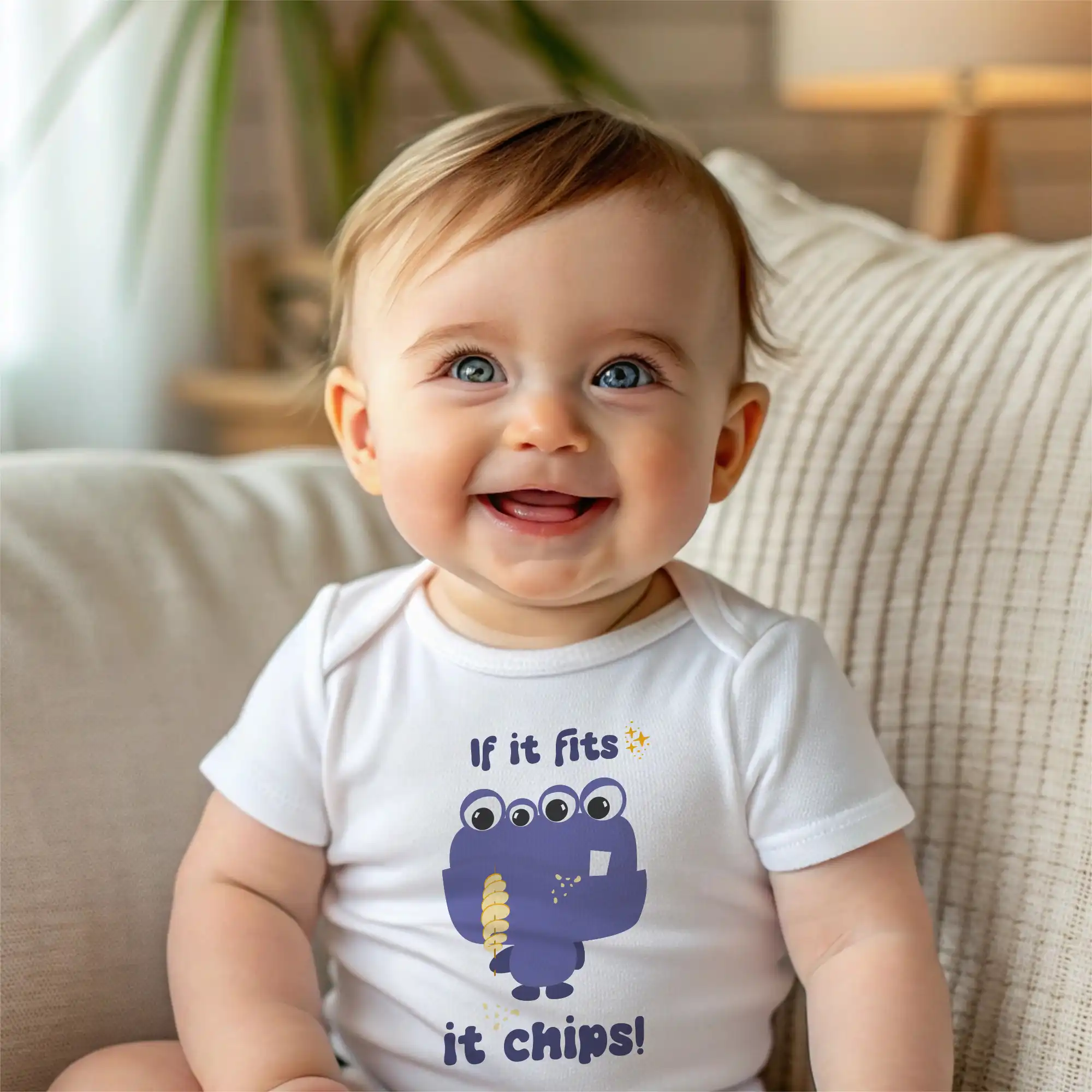 Imagine a mischievous purple monster with four wide, curious eyes holding a curly chip as crumbs scatter at its feet. Above its eager grin, the phrase “If It Fits, It Chips!” arches in bubbly, hand-drawn letters flecked with tiny bite marks. The monster’s stubby arms seem ready to snatch the next salty snack from an unsuspecting toddler hand, while pastel yellow chip fragments flutter around like confetti. This whimsical illustration perfectly captures the irresistible nature of crunchy treats and baby curiosity. Every time your little one crawls around in this graphic, the if it fits it chips baby bodysuit will spark knowing smiles and snack-time envy from fellow parents.